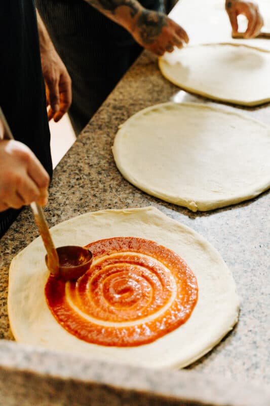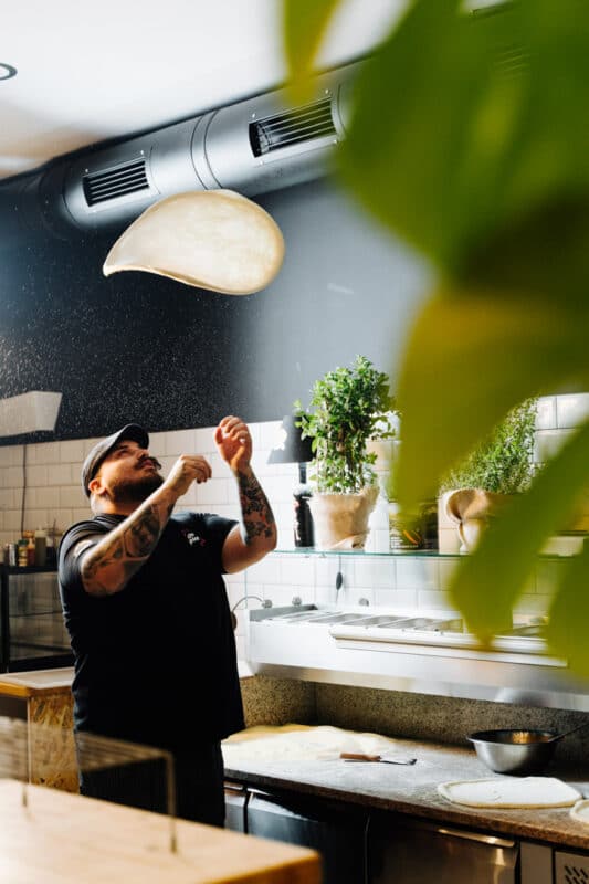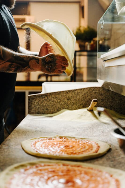 Εδώ, στα ζυμάρια της πίτσας ρίχνουν μπόλικη δουλειά, χρησιμοποιούν ιταλικά άλευρα από πετρόμυλο και τα περιμένουν υπομονετικά να ωριμάσουν για πολλές ώρες. Και αυτό κάνει τη διαφορά. Αυτά είναι τα ζυμάρια για την σωστή ναπολιτάνικη πίτσα, που βγαίνει σκανδαλωδώς κριτσανιστή και πανάλαφρη από τον αρτίστικο φούρνο που παίζει κυρίαρχο ρόλο στο χώρο. Χρηστικά και χρωματικά.