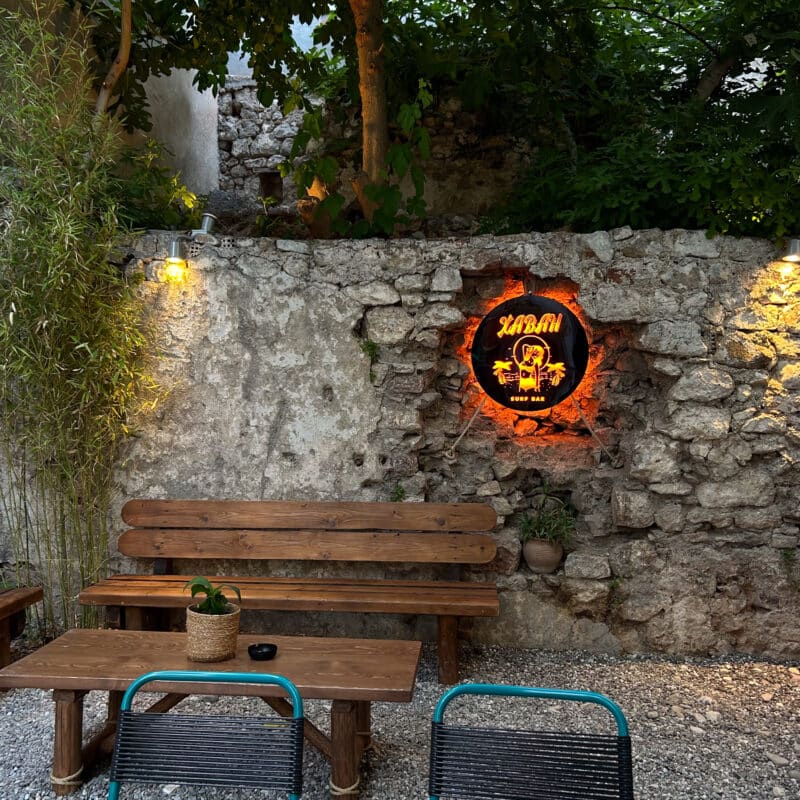 Μία φανταστική αυλή με στιλ και άποψη• μια μικρή όαση στην άκρη του Στενοπάζαρου. Την στόλισαν με τροπικά φυτά και μερικά μεσογειακά, έστρωσαν χαλίκι θέλοντας να μας κάνουν να φοράμε μόνο flip flops, έβαλαν ξύλινους πάγκους και spaghetti καρέκλες, κρέμασαν από άκρη σ’ άκρη μια σειρά από λαμπιόνια.