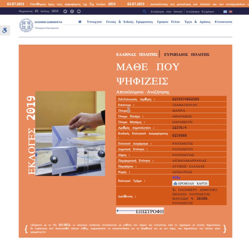 Tο υπουργείο Εσωτερικών συνιστά προς τους εκλογείς να αναζητήσουν το εκλογικό τους τμήμα στην ιστοσελίδα του, μέσω της ειδικής εφαρμογής “Μάθε Πού Ψηφίζεις” ή να καλέσουν τον αριθμό 2131361500 μέχρι και την Κυριακή, από τις 09:00 έως τις 19:00, προκειμένου να επιβεβαιώσουν το εκλογικό τμήμα στο οποίο θα ασκήσουν το εκλογικό τους δικαίωμα.