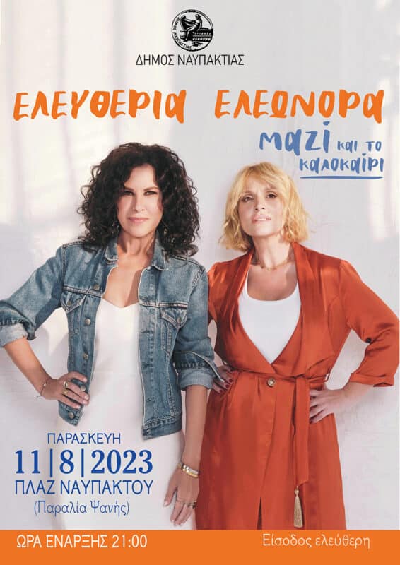 Η συναυλία του καλοκαιριού πλησιάζει. Την Παρασκευή, 11 Αυγούστου 2023 στις 9 το βράδυ θα βρεθούν οι Ελευθερία Αρβανιτάκη με την Ελεωνόρα Ζουγανέλη για μια μοναδική συναυλία στην παραλία Ψανής (πλαζ Ναυπάκτου) με ελεύθερη είσοδο!