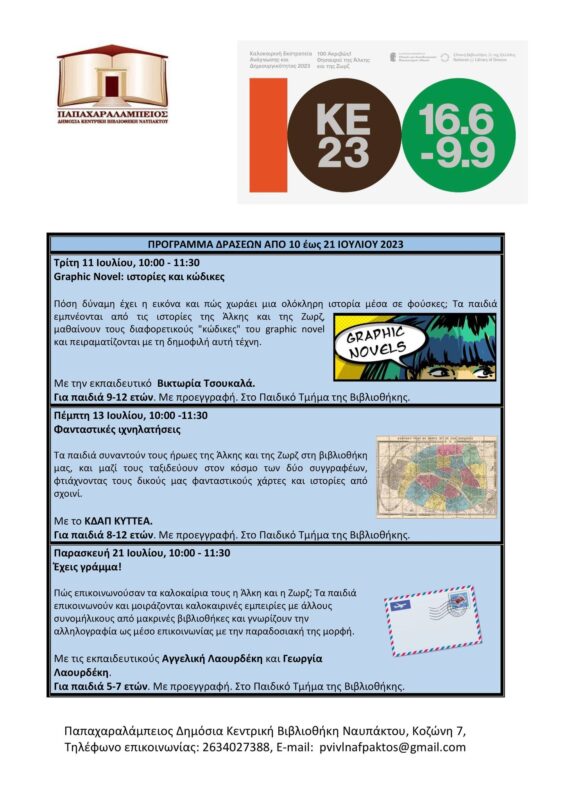Συνεχίζονται οι κρατήσεις για συμμετοχή των παιδιών στην Καλοκαιρινή Εκστρατεία της Εθνικής Βιβλιοθήκης [10-21/7] στην οποία συμμετέχει και η Παπαχαραλάμπειος Δημόσια Κεντρική Βιβλιοθήκη Ναυπάκτου, ενώ ακολουθούν νέες δράσεις μετά τις 21 Ιουλίου.