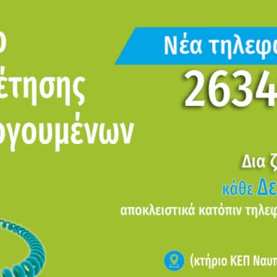 Ο Δήμος Ναυπακτίας ενημερώνει ότι, το Γραφείο Εξυπηρέτησης Φορολογουμένων διαθέτει νέα τηλεφωνική γραμμή: 26340 28737. Το Γ.Ε.Φ. στεγάζεται...