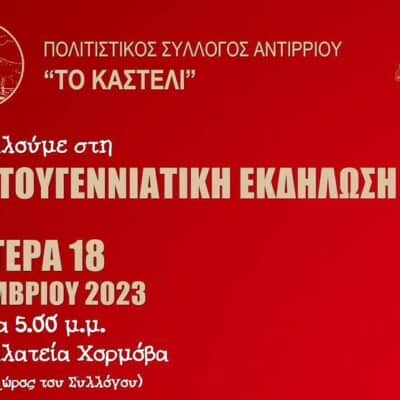 Ο Πολιτιστικός Σύλλογος Αντιρρίου «Το Καστέλι» σε συνδιοργάνωση με τον Δήμο Ναυπακτίας πραγματοποιούν Χριστουγεννιάτικη Εκδήλωση την Δευτέρα 18 Δεκεμβρίου 2023 και ώρα 5:00 μμ, στην Πλατεία...
