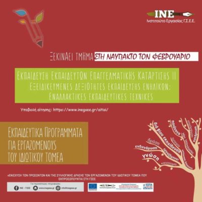 Το Ινστιτούτο Εργασίας της ΓΣΕΕ σε συνεργασία με το Εργατοϋπαλληλικό Κέντρο Ναυπακτίας & Δωρίδας υλοποιεί εξειδικευμένα προγράμματα κατάρτισης...