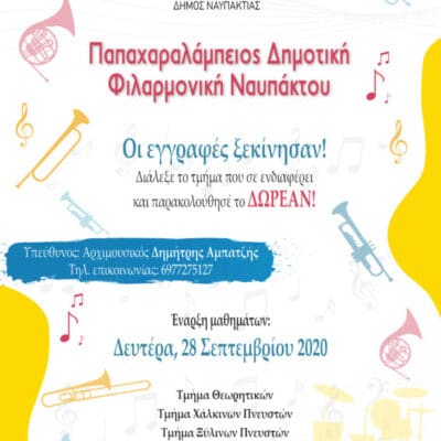 Ο Δήμος Ναυπακτίας ενημερώνει ότι ξεκίνησαν οι εγγραφές στην Παπαχαραλάμπειο Δημοτική Φιλαρμονική Ναυπάκτου για την περίοδο 2020-2021. Τα...