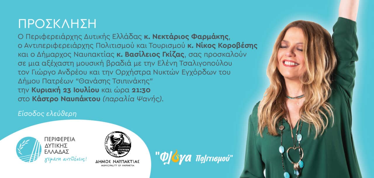Ο Περιφερειάρχης Δυτικής Ελλάδας Νεκτάριος Φαρμάκης, ο Αντιπεριφερειάρχης Πολιτισμού και Τουρισμού Νικόλαος Κοροβέσης και ο Δήμαρχος Ναυπακτίας Βασίλειος Γκίζας, προσκαλούν το κοινό σε μία μοναδική μουσική βραδιά με την Ελένη Τσαλιγοπούλου, τον Γιώργο Ανδρέου και την Ορχήστρα Νυκτών Εγχόρδων «Θανάσης Τσιπινάκης» του Δήμου Πατρέων, η οποία θα πραγματοποιηθεί την Κυριακή 23 Ιουλίου 2023 και ώρα 21:30 στο Κάστρο Ναυπάκτου (παραλία Ψανής).