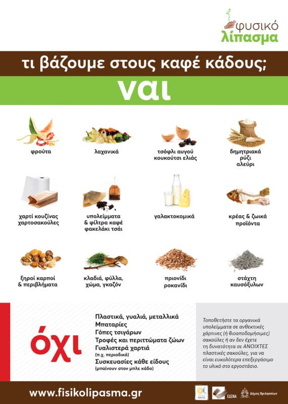 - Δημητριακά, ρύζι, άλευρα, υπολείμματα τροφών, υπολείμματα από φίλτρα καφέ και φακελάκι τσάι, κρέας, ψάρι, ζωϊκά προϊόντα, λαχανικά, φρούτα, φλούδες, χαρτί κουζίνας, χαρτοσακούλες, γαλακτοκομικά, ξηρούς καρπούς, στάχτη από τζάκι, τσόφλι αυγού, κλαδάκια, φύλλα και χώμα.