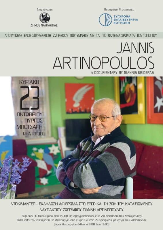Ένας τέτοιος ζωγράφος, ο ναυπάκτιος Γιάννης Αρτινόπουλος, επιβάτης και ιχνηλάτης στη σύγχρονη εικαστική αλέα, βούτηξε και συνεχίζει να βουτά το πινέλο του στα νάματα των βιωμάτων που του χαρίζει το ταξίδι της ζωής του. Αυτά ιχνηλατεί και το αφιερωματικό ντοκιμαντέρ, με επίκεντρο το έργο του και τη ζωή του, που θα παρουσιαστεί σε πρώτη προβολή σε μια ειδική τιμητική εκδήλωση για τον καταξιωμένο εικαστικό, την Κυριακή, 23 Οκτωβρίου στον Πύργο Μπότσαρη στη Ναύπακτο, στις 19:00’. Την εκδήλωση θα προλογίσει ο Διευθυντής της Παπαχαραλαμπείου Δημόσιας Κεντρικής Βιβλιοθήκης Ναυπάκτου Γιάννης Χαλάτσης και ομιλία θα παραθέσει ο Επιστημονικός Συνεργάτης των Σύγχρονων Εκπαιδευτηρίων Κοτρώνη Δημήτρης Σιούτης. Θα χαιρετίσει ο Δήμαρχος Ναυπακτίας Βασίλης Γκίζας.