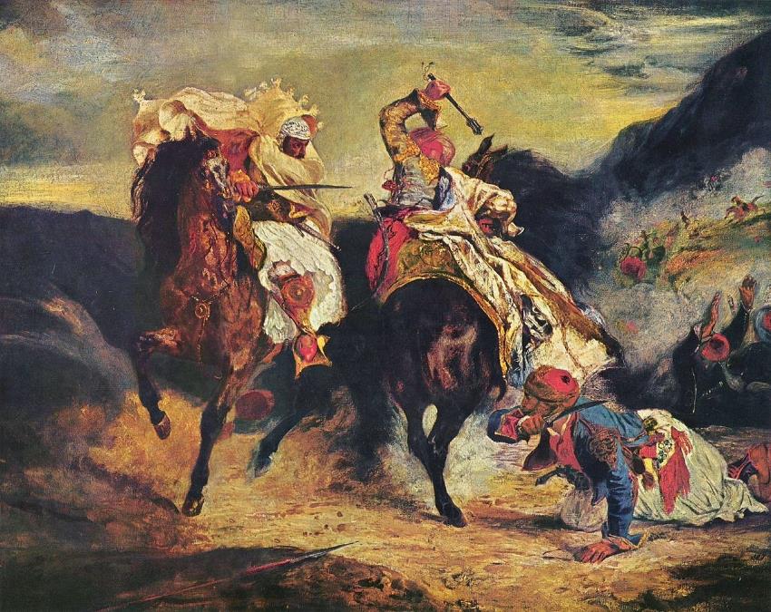 Η πρώτη έκθεση με τίτλο «Ο Ευγένιος Ντελακρουά και η Ελληνική Επανάσταση» περιλαμβάνει 7 έργα του Ευγένιου Ντελακρουά, ο οποίος αποτίει φόρο τιμής στο ηρωισμό του Ελληνικού Έθνους. Τα έργα αυτά, τα οποία παρέχονται από την «Agence Photographique – Réuniondes Musées Nationaux – Grand Palais – Louvre » είναι τα εξής: «Το Πορτραίτο του Eugène Delacroix», «Η Ελλάδα στα ερείπια του Μεσολογγίου», «Σκηνές από τη σφαγή στην Χίο», «Σκηνή μάχης μεταξύ Ελλήνων και Τούρκων», «Η μάχη μεταξύ του Γκιαούρη και του Πασά», «Δυο Έλληνες πολεμιστές χορεύοντας», «Η σφαγή της Χίου».