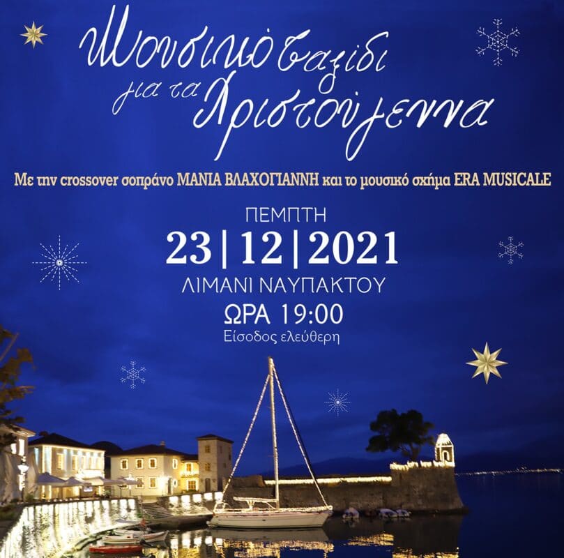 Ο Δήμος Ναυπακτίας, στο πλαίσιο των Εορταστικών του Εκδηλώσεων για τα Χριστούγεννα παρουσιάζει ένα μοναδικό μουσικό ταξίδι με την crossover σοπράνο Μάνια Βλαχογιάννη και το μουσικό σχήμα ERA MUSICALE, αυτή την Πέμπτη, 23 Δεκεμβρίου 2021, ώρα 19:00, στο Λιμάνι της Ναυπάκτου.