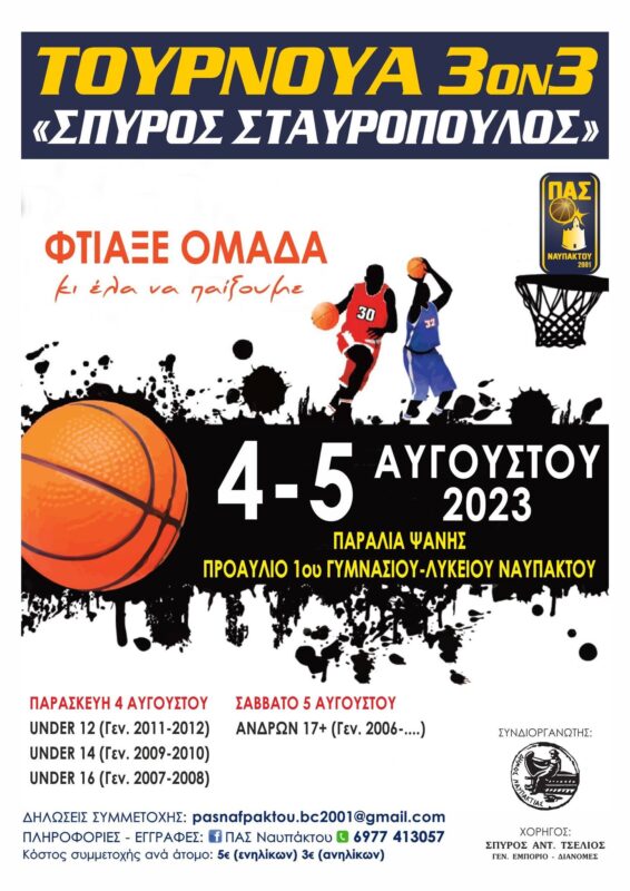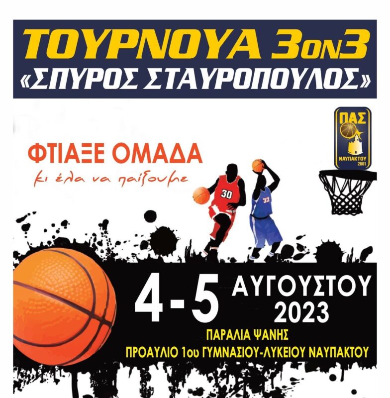 Με κεντρικό σύνθημα του τουρνουά «Φτιάξε ομάδα κι έλα να παίξουμε» δίνεται η ευκαιρία σε μικρούς και μεγάλους να απολαύσουν τη χαρά του παιχνιδιού σε έναν ωραίο πνεύμονα άθλησης της πόλης. Το Τουρνουά 3on3 του ΠΑΣ ΝΑΥΠΑΚΤΟΥ, θα φέρει πλέον το όνομα του Σπύρου Σταυρόπουλου, ως ελάχιστο φόρο τιμής στη μνήμη του προπονητή του Συλλόγου, αρωγό του συγκεκριμένου τουρνουά basket, αλλά και ως μια διαρκή υπενθύμιση και ανάδειξη των αξιών και των αρχών που αυτός αντιπροσώπευε. Με απαρχή λοιπόν το επερχόμενο τουρνουά 3 on 3, που θα διεξαχθεί στις 4-5 Αυγούστου, στο χώρο του προαυλίου του 1ου Γυμνασίου – Λυκείου, εκεί που ο Σπύρος δίδασκε ως καθηγητής Φυσικής Αγωγής, μετονομάζεται σε Τουρνουά 3 on 3 «ΣΠΥΡΟΣ ΣΤΑΥΡΟΠΟΥΛΟΣ».