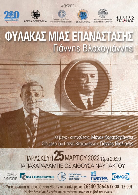 Ο Δήμος Ναυπακτίας σε συνεργασία με την Αδελφότητα Ναυπακτίων Νομού Αττικής «Ο Έπαχτος», διοργανώνει στη Ναύπακτο, την παράσταση του Μάνου Καρατζογιάννη «Φύλακας μιας Επανάστασης», την Παρασκευή 25 Μαρτίου και ώρα 8:30μ.μ., στην Παπαχαραλάμειο Αίθουσα Ναυπάκτου, μετά την επιτυχημένη παρουσίασή της στον Αύλειο Χώρο των Καπναποθηκών Παπαστράτου στο Αγρίνιο και στο Διεθνές Φεστιβάλ Αναλόγιο, στο Μέγαρο Δουκίσσης Πλακεντίας και στο Θέατρο Σταθμός.