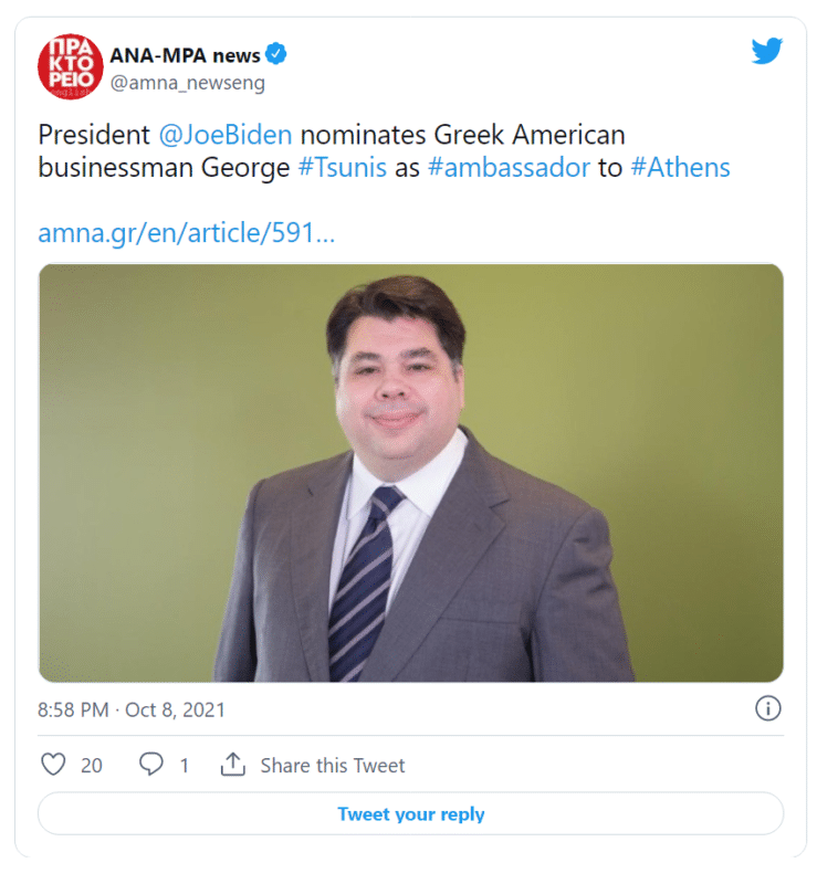 Ο Ελληνοαμερικανός επιχειρηματίας Τζορτζ Τζέιμς Τσούνης είναι η πρόταση του προέδρου Τζο Μπάιντεν για τη θέση του πρεσβευτή των ΗΠΑ στην Αθήνα. Μετανάστης δεύτερης γενιάς, με γονείς από την ορεινή Ναυπακτία, ο Τζορτζ Τσούνης μεγάλωσε μέσα στην ελληνική κοινότητα της Νέας Υόρκης.
