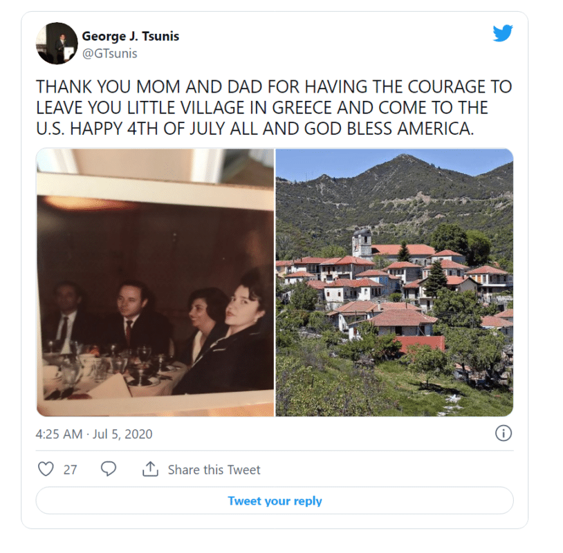 «Ευχαριστώ μαμά και μπαμπά που είχατε το κουράγιο να αφήσετε το μικρό χωριό στην Ελλάδα και ήρθατε στις ΗΠΑ» σημείωνε το 2020, με αφορμή την 4η Ιουλίου. Την ανάρτησή του συνόδευε με μια παλαιότερη φωτογραφία των γονιών του και μια εικόνα από το γραφικό χωριό της Ναυπακτίας.