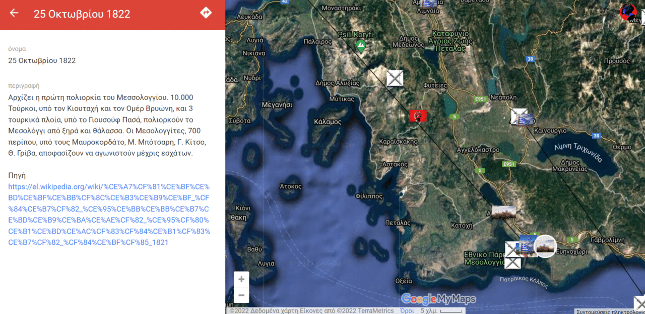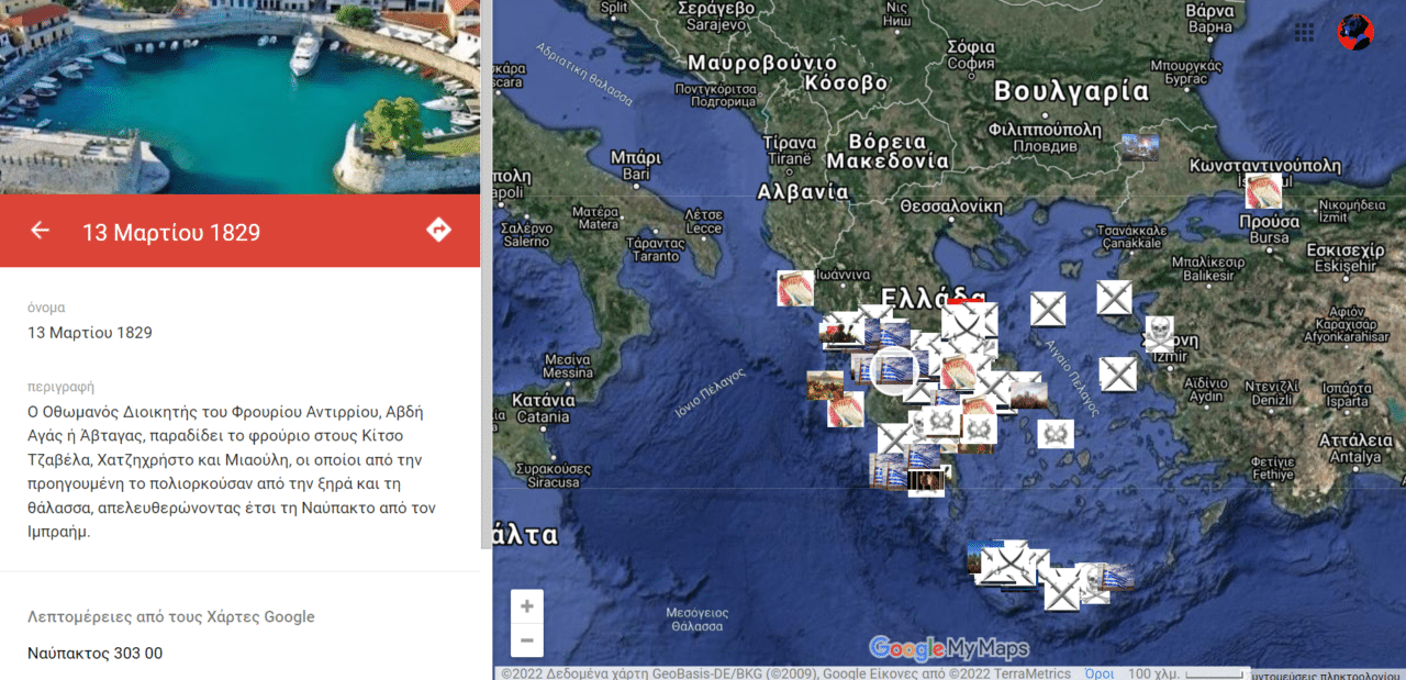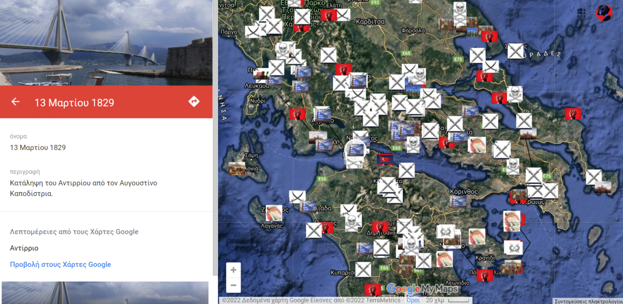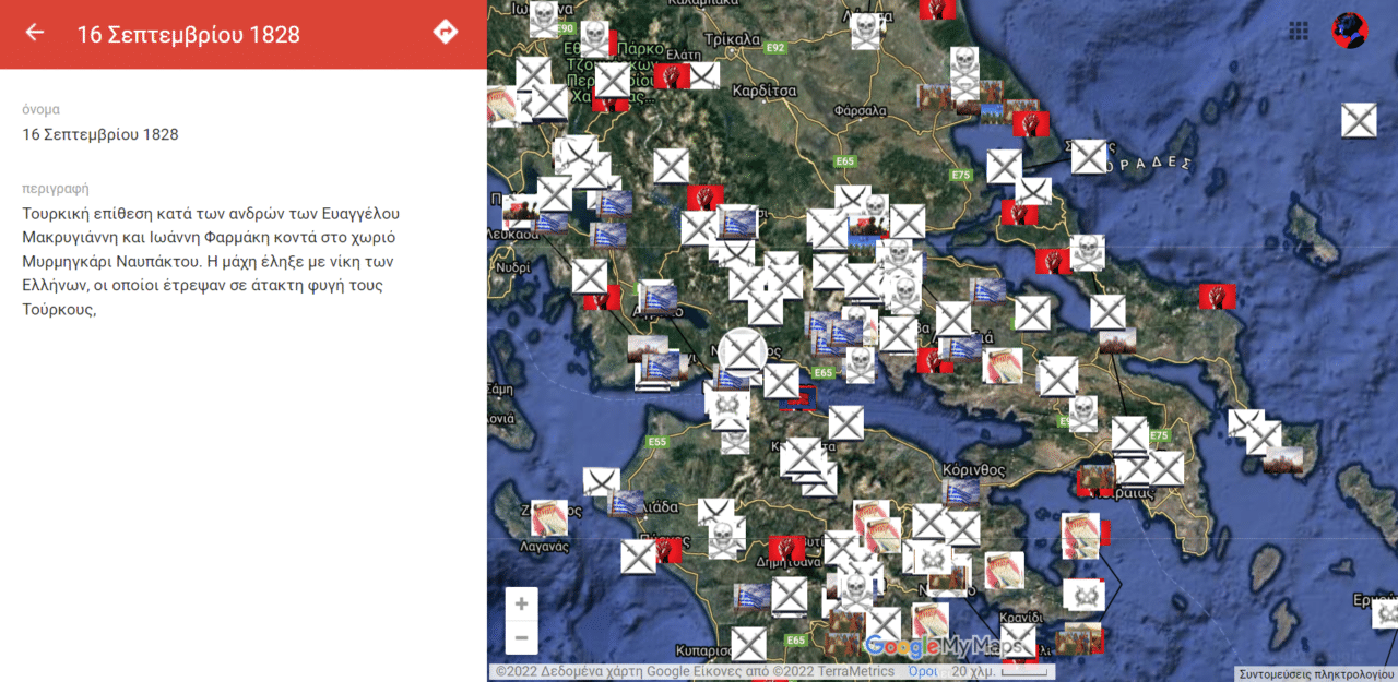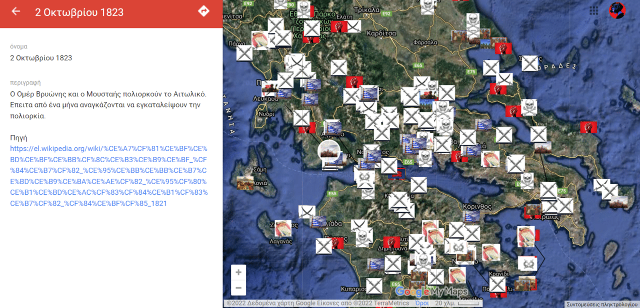 Πόσες φορές έχετε πιάσει τον εαυτό σας να μην θυμάται ιστορικά γεγονότα, ευρέως διαδεδομένα; Πόσες φορές έχετε μπερδέψει ιστορικές ημερομηνίες ή ιστορικά πρόσωπα; Δύο φίλοι τα έβαλαν κάτω κι αποφάσισαν να φτιάξουν έναν ψηφιακό χάρτη των γεγονότων της Ελληνικής Επανάστασης από το 1821 μέχρι το 1832 και συμπεριέλαβαν εκατοντάδες μάχες, συνθήκες κι άλλα άξια αναφοράς γεγονότα χρησιμοποιώντας την εφαρμογή google maps.