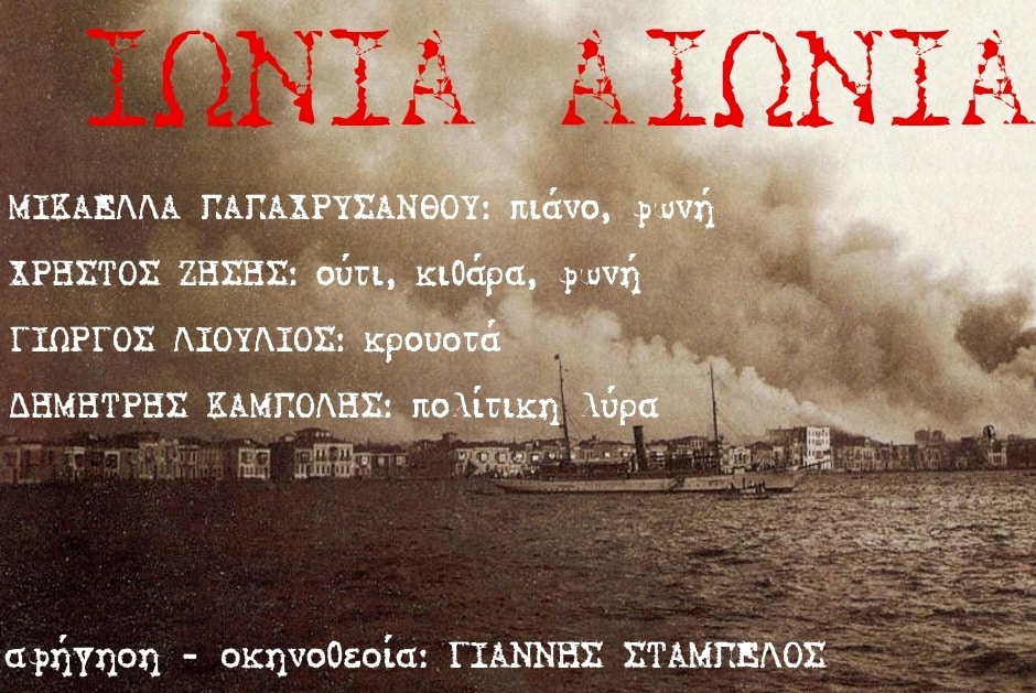 Η μουσική, αυτή, παράσταση έχει θέμα τη Μικρασιάτικη Καταστροφή και απαρτίζεται από παραδοσιακά τραγούδια που το περιεχόμενο τους πραγματεύεται το κοινωνικό, πολιτισμικό, θρησκευτικό και ιστορικό γίγνεσθαι της Σμύρνης του 1920 μέχρι την καταστροφή της πόλης, το 1922.