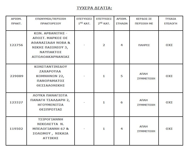 Στη β’ κατηγορία κερδών βρέθηκαν 5 επιτυχίες που κερδίζουν από €12.825. Δύο μάλιστα από τα πεντάρια προέκυψαν απο το δελτίο που κατατέθηκε σε πρακτορείο της Ναυπάκτου. Ο τυχερός κερδίζει δηλαδή συνολικά σχεδόν 26 χιλ. ευρώ.