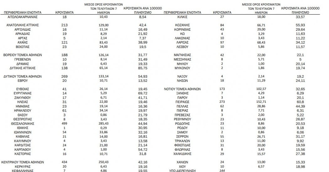 Με βάση τα επιβεβαιωμένα κρούσματα των τελευταίων 7 ημερών, 97 θεωρούνται σχετιζόμενα με ταξίδι από το εξωτερικό και 2.511 είναι σχετιζόμενα με ήδη γνωστό κρούσμα.