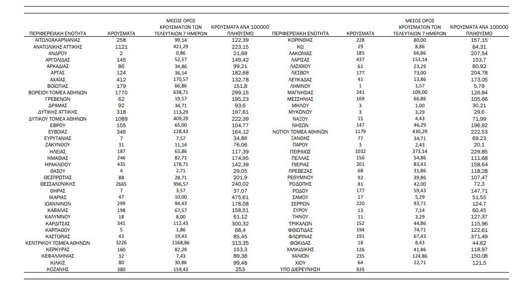 Αναλυτικά η κατανομή των 21.637 νέων εγχώριων κρουσμάτων ανά Περιφερειακή Ενότητα:
