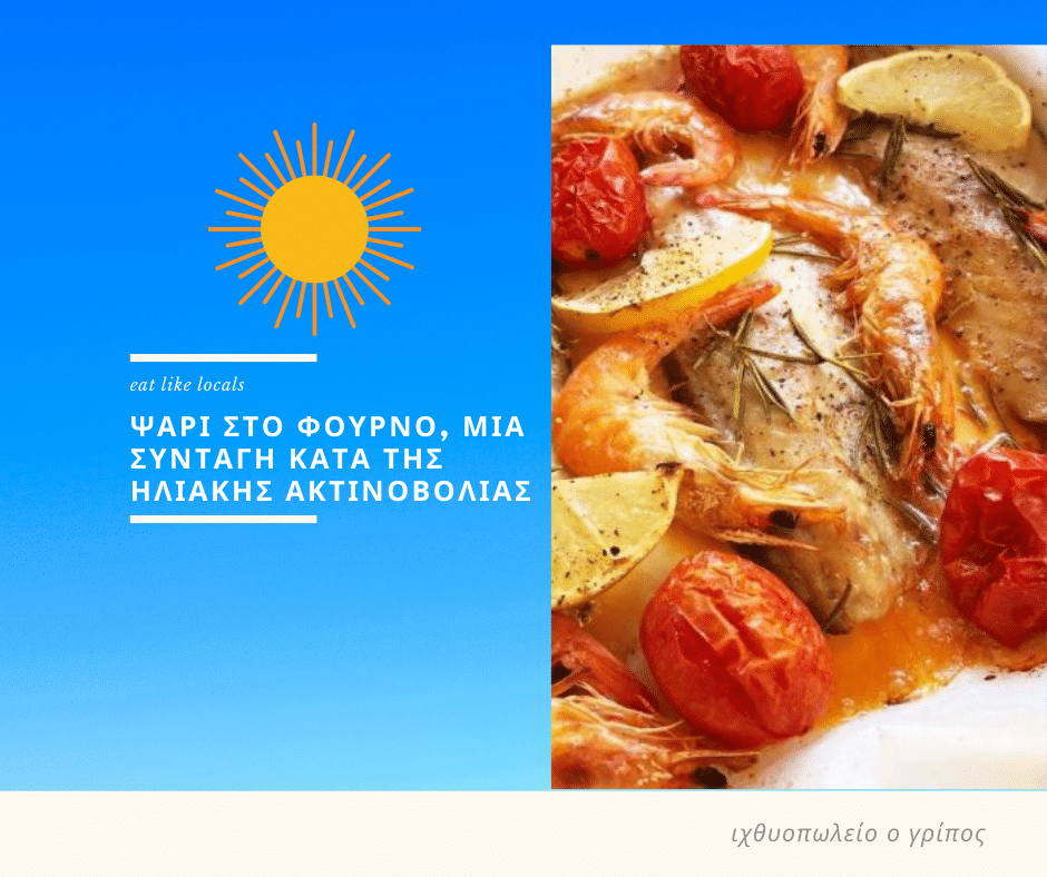Σήμερα το καλάθι των λοcals γεμίζει με ένα κιλό ψάρια από το ιχθυοπωλείο ο ‘ΓΡΙΠΟΣ’ , κατά προτίμηση με σκουμπρί για να ετοιμάσουμε μια συνταγή όπως μας την πρότεινε ο Γρηγόρης Λόης κατά της ηλιακής ακτινοβολίας, με χυμό τομάτας, άφθονη ρίγανη και ελαιόλαδο.