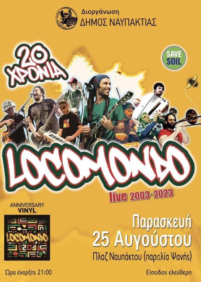 Ο Δήμος Ναυπακτίας σας προσκαλεί την Παρασκευή, 25 Αυγούστου στις 21:00 στην παραλία Ψανής, στο μεγαλύτερο πάρτυ με τους Locomondo που γιορτάζουν!