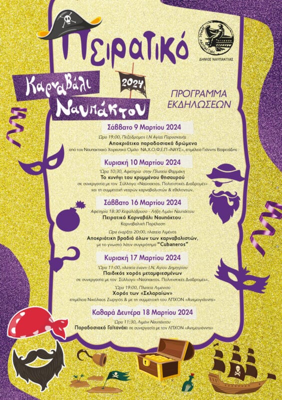 Με παραδοσιακά δρώμενα, κρυμμένο θησαυρό, παιδικό χορό μεταμφιεσμένων, latin συναυλία αλλά και το παραδοσιακό γαϊτανάκι την Καθαρά Δευτέρα, ο Δήμος Ναυπακτίας σε συνεργασία με τον Σύλλογο «Ναύπακτος: Πολιτιστικές Διαδρομές», τον Ναυπακτιακό Χορευτικό Όμιλο ΝΑ.Χ.Ο.Φ.Ε.Π «ΝΑΥΣ» και ΛΠΧΟΝ «Ανεμογιάννης» προσκαλεί όλες και όλους να γιορτάσουν τις φετινές Απόκριες στην Ναύπακτο! Ξεχωριστή στιγμή των φετινών εκδηλώσεων αναμένεται η Καρναβαλική Παρέλαση… που θα είναι άκρως πειρατική!