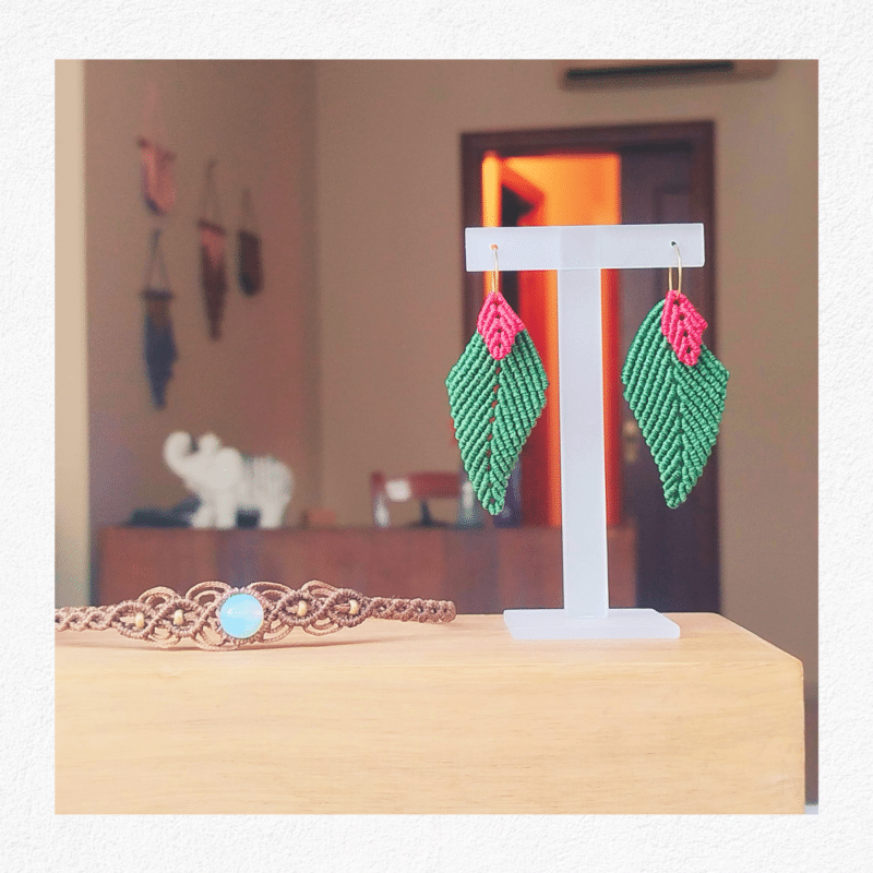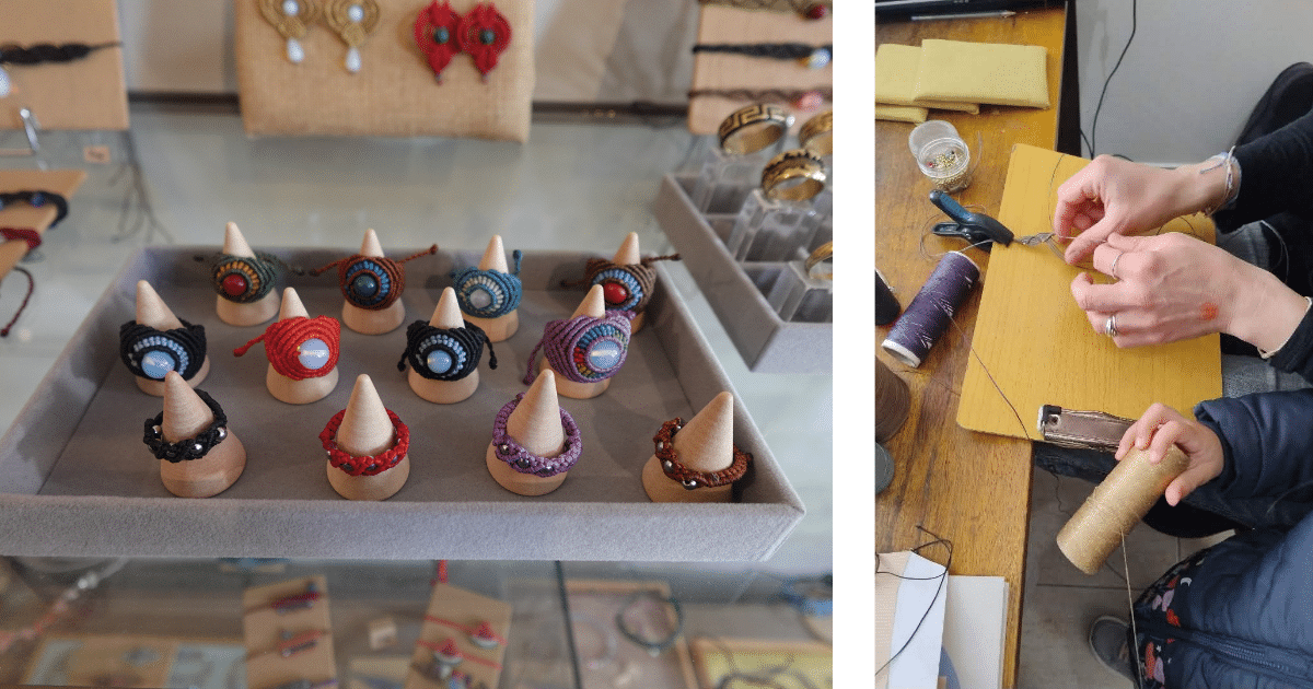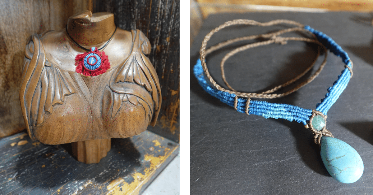 Η Ελένη πλέκει μακραμέ δημιουργίες, προσθέτοντας μια μαλακή υφή στον σκληρό κόσμο του ασημιού και του μπρούτζου. Τα ιδιαίτερα, δαχτυλίδια, κολιέ και σκουλαρίκια με τους χρωματιστούς ημιπολύτιμους λίθους εντάσσονται αρμονικά στο σύνολο.