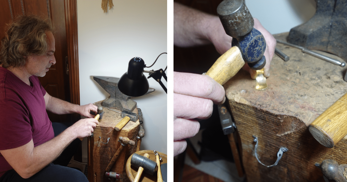 «Χειροποίητο σημαίνει πείσμα, φαντασία και όρεξη», εξηγεί καθώς σφυρηλατεί ένα φύλλο μετάλλου.