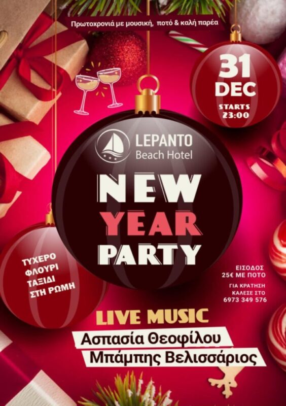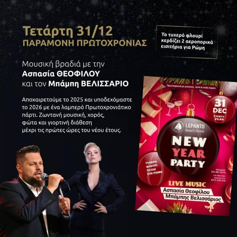 Την Τετάρτη 31/12, παραμονή Πρωτοχρονιάς, το Lepanto Beach Hotel μας προσκαλεί σε μια λαμπερή βραδιά για να αποχαιρετήσουμε το 2025 και να υποδεχτούμε το 2026 με μουσική, κέφι και γιορτινή διάθεση.