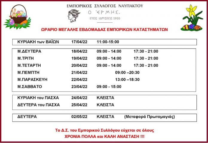 Ξεκινάει από την Κυριακή των Βαΐων 17 Απριλίου το πασχαλινό εορταστικό ωράριο των καταστημάτων. Το προτεινόμενο ωράριο λειτουργίας των καταστημάτων στην Ναύπακτο την εορταστική περίοδο για το Πάσχα 2022 ανακοίνωσε ο Εμπορικός Σύλλογος Ναυπάκτου ‘Ερμής”.
