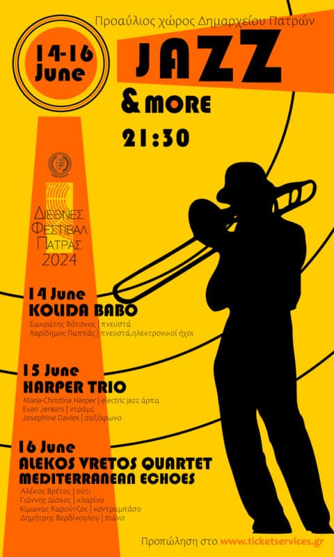 Η ενότητα jazz & more ανοίγει τις φετινές εκδηλώσεις του Διεθνούς Φεστιβάλ της Πάτρας στις 9.30 το βράδυ την Παρασκευή 14 Ιουνίου στο προαύλιο του νέου δημαρχείου (παλαιό Αρσάκειο). Οι φίλοι της jazz και… όχι μόνο, θα παρακολουθήσουν ένα τριήμερο μουσικής πανδαισίας και ξενάγησης από ξεχωριστούς καλλιτέχνες στους δρόμους της jazz και τα αχαρτογράφητα» μονοπάτια της.