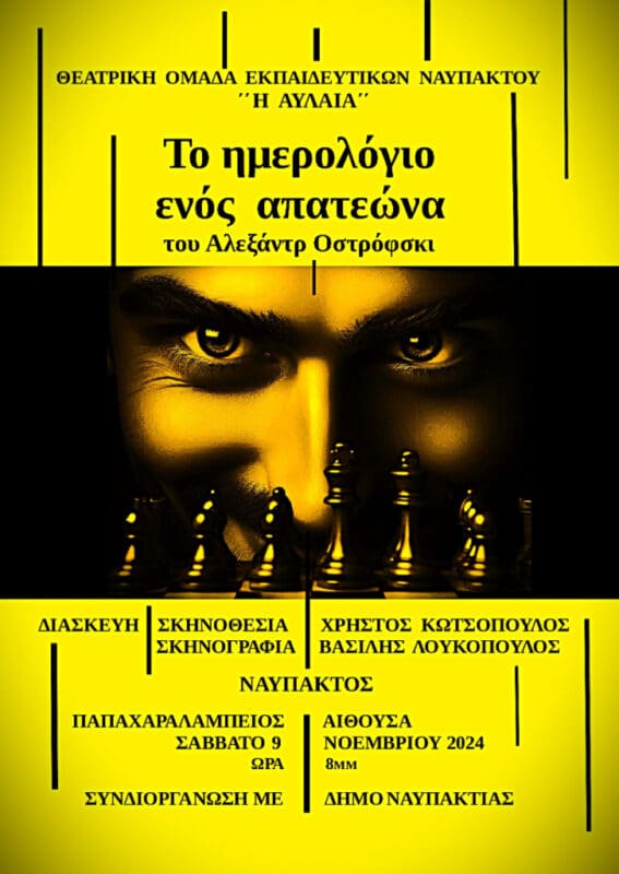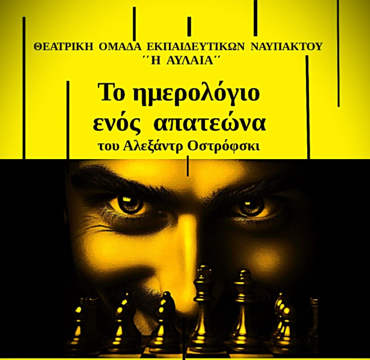 Η Θεατρική Ομάδα Εκπαιδευτικών Ναυπάκτου «Η Αυλαία» σε συνδιοργάνωση με τον Δήμο Ναυπακτίας παρουσιάζουν την παράσταση «Το Ημερολόγιο ενός απατεώνα» του Αλεξάντρ Οστρόφσκι, αυτό το Σάββατο, 9 Νοεμβρίου 2024 και ώρα 20:00’ στην Παπαχαραλάμπειο Αίθουσα.