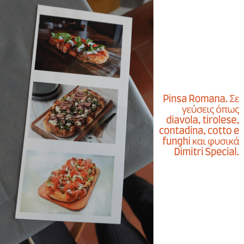 Και ναι, εδώ θα βρεις την αυθεντική τραγανή Pinsa Romana. Σε γεύσεις όπως diavola, tirolese, contadina, cotto e funghi και φυσικά Dimitri Special – με μοτσαρέλα, πατάτα και κρέμα τρούφας. Έχω αφήσει χώρο γι’ αυτή!