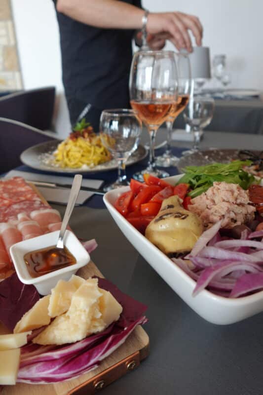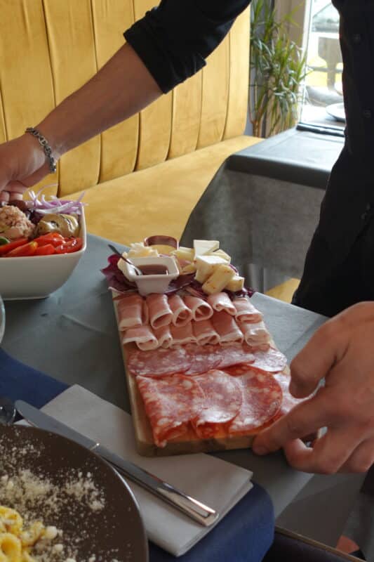 Σαλάτα με φρέσκα λαχανικά, και μια πλούσια ποικιλία από εκλεκτά, premium ιταλικά αλλαντικά και τυριά (προσούτο, γκοργκοντζόλα, παρμεζάνα, κ.ά.), Ό,τι δηλαδή θα μπορούσε να λαχταρήσει κανείς από τον πλούτο των απλών, αλλά ποιοτικών, προϊόντων απλωμένα σε αφθονία μπροστά σου.