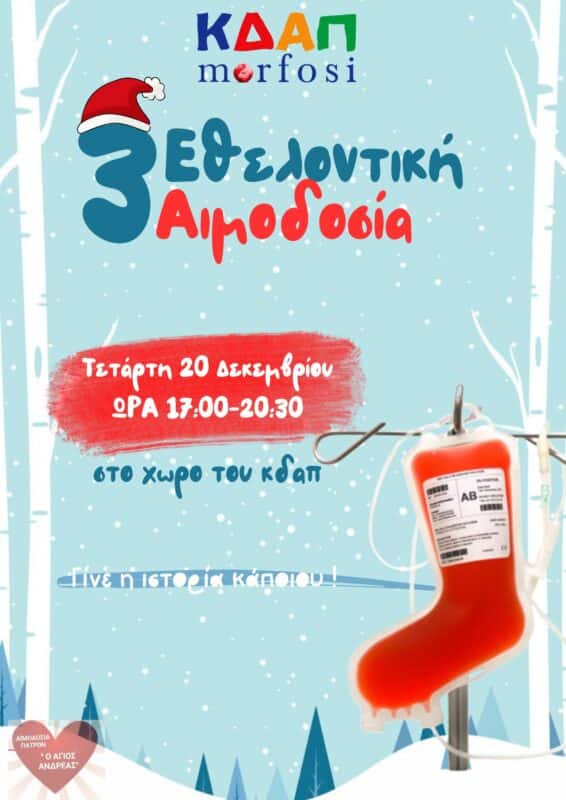 Εθελοντική αιμοδοσία διοργανώνει το ΚΔΑΠ morfosi σε συνεργασία με την Αιμοδοσία Αγίου Ανδρέα την Τετάρτη 20/12/2023 από τις 17:00 έως τις 20:30 το βράδυ στον χώρο του. Μας περιμένουν όλους να ενωθούμε για καλό σκοπό ακόμη μια φορά! Χαρίζουμε το πολυτιμότερο δώρο. Δίνουμε αίμα!