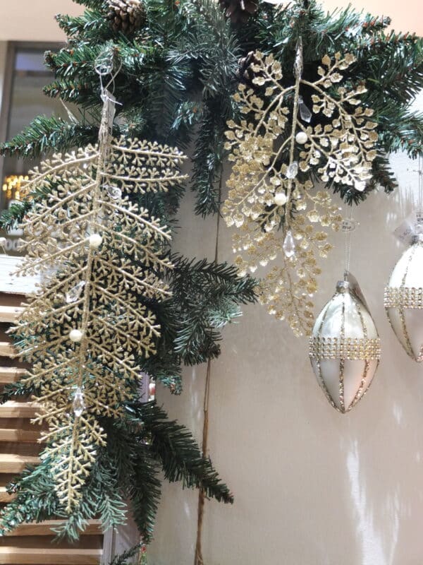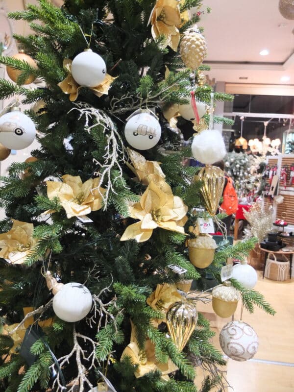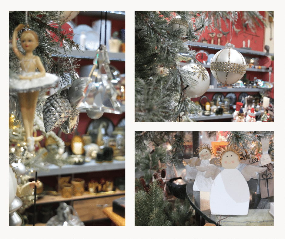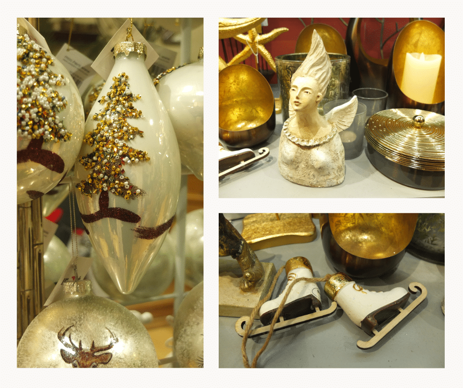 Σε χρυσές αποχρώσεις: Μπάλες με γκλίτερ, μεταλλικά κηροπήγια, πήλινα αγγελούδια, ξύλινοι καρυοθραύστες και τάρανδοι, παγοπέδιλα σαν στολίδι και πορσελάνινα ρόδια στην απόχρωση της πούδρας.